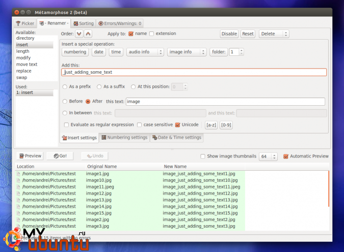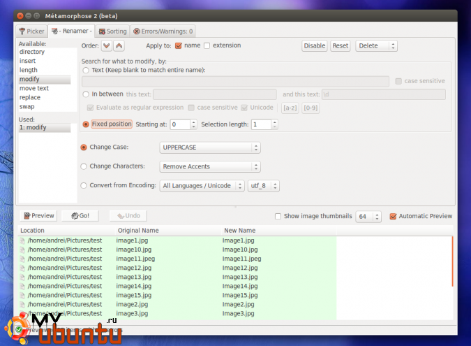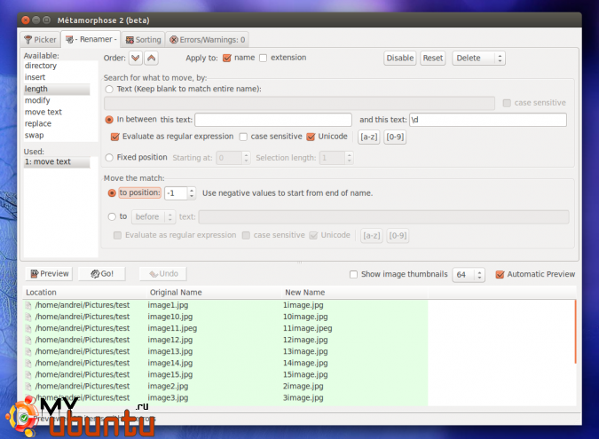 Поскольку Metamorphose поддерживает большую комбинацию опций по переименованию файлов, ниже я перечислю лишь некоторые базовые возможности: